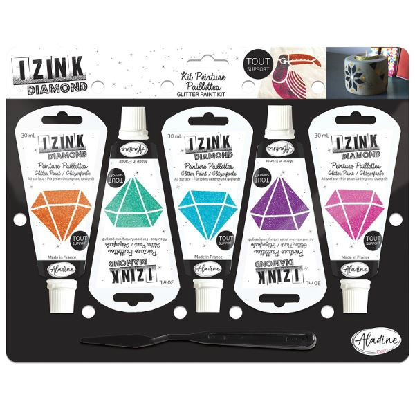 IZINK Diamond je vysoce třpytivá barva s pastovitou konzistencí vhodná pro použití na různé povrchy jako je papír, karton, sklo, kámen, textil apod. Barvy lze vzájemně míchat, ale každé míchání snižuje jejich zářivost.