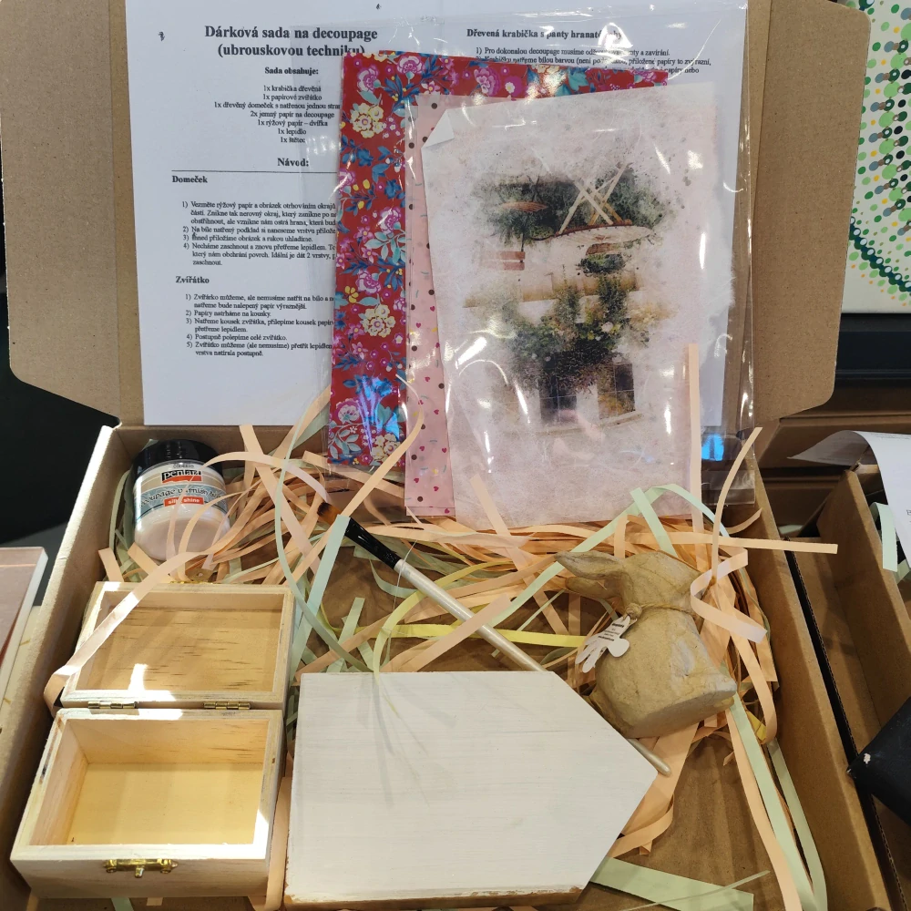 Naše sady na decoupage jsou určeny nejen pro začátečníky ale i pokročilé. V základní sadě si můžete vytvořit krabičku, domeček a jedno zvířátko, které mohou tvořit i děti od 6-ti let (samostatně), mladší pod dohledem.